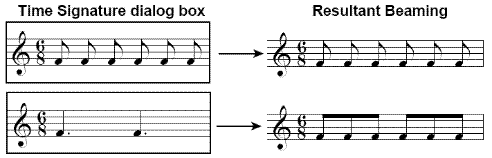 The way you define your meter is important, because it also governs beaming. In the case of cut time, for example, you should set the scroll bars so that the display shows two half notes, meaning that the eighth notes will be beamed together in groups of four. This is particularly important when you’re working in 6/8 time; if you “spell” the time signature as a string of six eighth notes, Finale won’t perform any automatic eighth-note beaming, as shown below (top example). If you “spell” it as two dotted quarter notes, however, Finale will beam eighth notes in groups of three (bottom example).