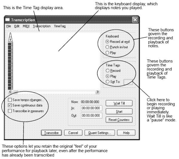 Note: It is no longer necessary to use Transcription Mode to record continuous data. Continuous data (sustain pedal, pitch bends, etc) can be recorded in a standard HyperScribe session. See Record Continuous Data dialog box.
