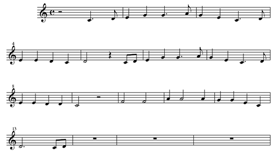 The measure you’ve been working on now contains the pickup notes for “Oh, Susannah.” Using your knowledge of the Speedy Entry Tool, enter the next twelve measures as shown. For the moment, however, don’t enter any music past measure 13. Remember the Speedy Entry keyboard commands you’ve learned: