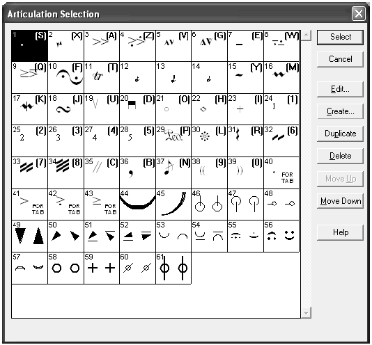 Incidentally, some symbols, such as <, have been defined to flip upside-down automatically when a note’s stem direction changes (as a result of a transposition, for example). Articulations with an associated upside-down symbol appear above one another in their selection square.