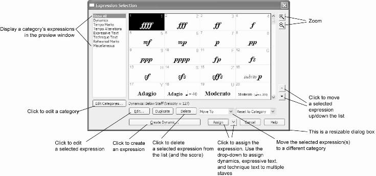 Note the categories on the left side of this dialog box (“Dynamics,” “Tempo Marks,” Etc.). Each of these categories include markings similar in appearance and positioning. Settings for a category can be changed, altering the appearance and/or positioning of all expressions in that category. You will learn more about editing categories soon.