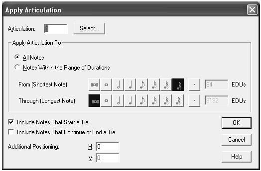 Finale offers yet another method for entering several articulations at once, and this one is the fastest of them all. It combines the power of Metatools with Finale’s ability to select a region of notes.