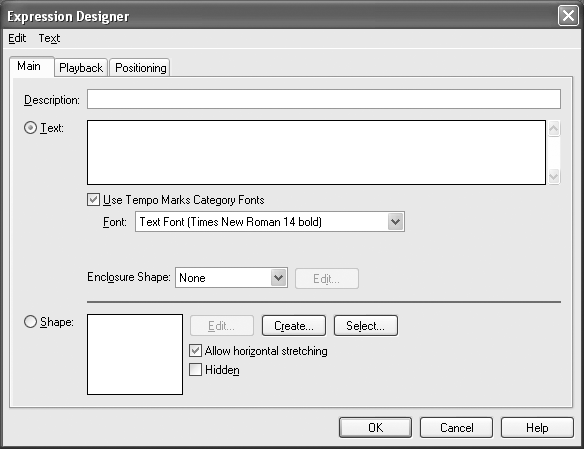 - Click the Tempo Marks category and then click Create. The Text Expression Designer dialog box appears.