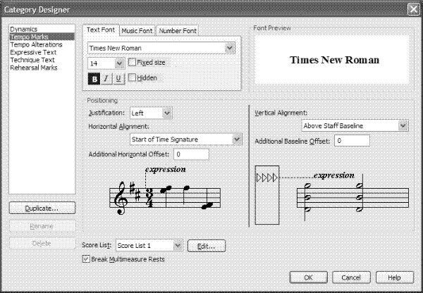You can use the subsequent Positioning drop-down menus to specify the positioning for tempo marks. Use the visual examples as a guide. The Score List settings allow you to assign the expression to specific staves. You will learn more about Score Lists soon.