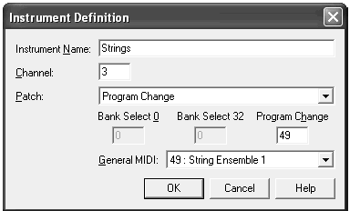 From the Instrument drop-down list across from the Strings staff, choose New Instrument. Name the Instrument “Strings,” and assign it to Channel 3. From the General MIDI menu, choose “49: String Ensemble 1.” Click OK.