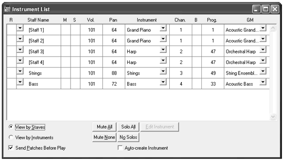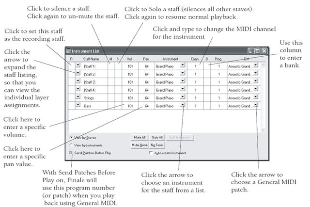 Usually, the first step to preparing a score for playback is assigning instruments to staves. If you began your score (or added staves) with the Setup Wizard, instruments have been assigned for you automatically. Even so, you may need to edit the channel, patch, or bank depending on your MIDI output device. For example, setting each staff to its own channel allows you to make changes to each staff individually in real-time using the Mixer or Staff Controls. You can modify the instrument sound, volume, panning, and channel for every staff individually. Furthermore, you can adjust all of these settings for separate layers (voices) within a single staff.