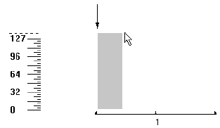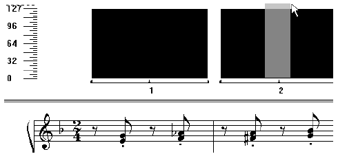 Note, too, that the notes in the display no longer have handles. That’s because controller information is independent of the actual notes being played—you can press the pedal even during a measure of rests, if you want. Therefore, you specify where you want to insert a “pedal down” message (or another on/off controller, or a patch change) by dragging through a sliver of the graph area.