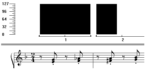 Pedaling will appear in this window in bar graph form. In the example at right, the pedal was depressed just after the second beat, and released after the fourth beat.