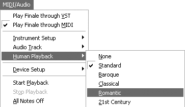 When you start a new Finale document, Human Playback is on by default and set to the “Standard” playback style. Simply add some of the markings just mentioned and playback the score to hear Human Playback at work. To customize Human Playback’s interpretation, do the following: