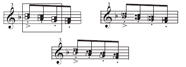 Here’s a quick rundown of the remaining MIDI Tool menu commands. These descriptions assume you’ve first selected the music to be edited. Remember that when you’re not in the MIDI Tool split-window, you select measures exactly as you would with the Selection Tool—by clicking a single measure, drag-enclosing several, and so on. Within the MIDI Tool split-window, you can edit a single staff, and you select notes either by dragging through the graph region or by selecting individual note handles in one of the ways shown here: