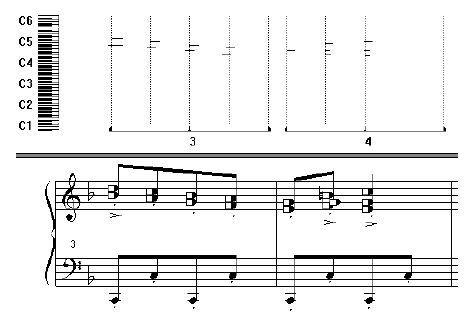 You’ll notice that the graph in the MIDI Tool split-window has changed. Now you’re seeing each note represented by a thin horizontal line; the longer the line, the longer the note’s duration. You’ll also see several thin gray vertical gridlines; these gridlines represent the strict quantized “locations” of the notated notes: