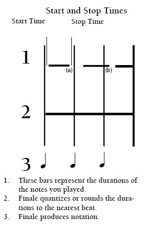 In fact, Start Time measures the difference between the notated (quantized) value’s starting point and the moment you actually struck the note in your performance. In the figure on the right, the Start Time is a positive number for the first note (because it was played slightly after the beat), and the Stop Time is a negative number (because the note was released slightly before the next beat).