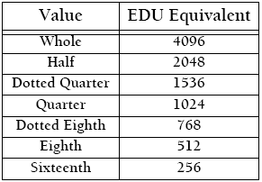 The Start and Stop Times are measured in Finale’s own very small durational units, called EDUs (ENIGMA Durational Units)—1024ths of a quarter note. The following table has some common EDU equivalents (a full table appears under Equivalents in the Appendix of the User Manual.)