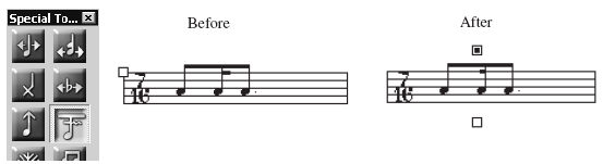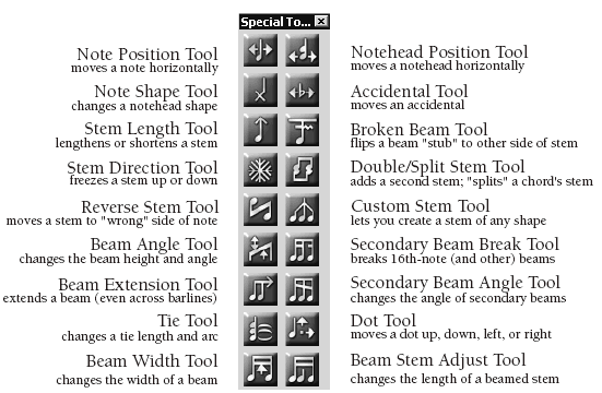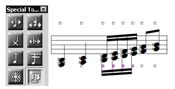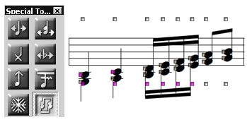 The Special Tools Tool provides you with fine-tuning control over spacing, beaming, ties, dots, and stems.