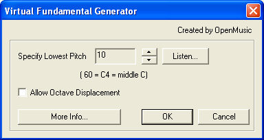 Select a sequence of chords in one staff with the Selection Tool l. All chords must be in layer 1, voice 1. From the Plug-ins menu, choose Scoring and Arranging, Composer’s Assistant, and then Virtual Fundamental Generator.