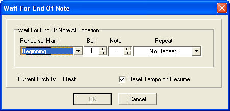 From the Utilities menu, choose Add SmartMusic Markers. Select Wait for End of Note from the marker list on the left and click Add. Or, select an existing Wait for End of Note marker from the Marker window and click Edit.