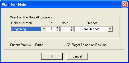 Use the settings in this dialog box to control the type and measure assignment for the Wait for Note marker you are adding or editing. Using the Rehearsal Mark or Bar and Note setting, specify the placement of this marker. Use this dialog to place the marker on the note you want to resume the accompaniment. SmartMusic will resume its performance upon hearing this note. (A resume marker is added for you automatically. See SmartMusic Performance Markers for more information).