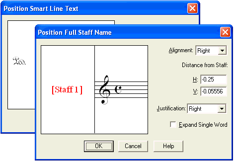 To set the global position for all full or abbreviated group names in your score, click the Staff Tool. Choose Full Group Name or Abbreviated Group Name from the Set Default Name Positions submenu of the Staff menu. The Position Full Group Name--Default or Position Abbreviated Group Name--Default dialog box appears.