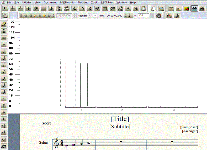 The notes displayed in the MIDI tool split-window were entered with one of Finale’s step-time entry tools. Therefore, each note’s Start Time and Stop Time is zero, as you can see from the fact that each horizontal line (representing a note’s duration) ends flush with one of the dotted vertical lines. (The vertical lines represent the notated, or quantized, attack and release points of the notes.)